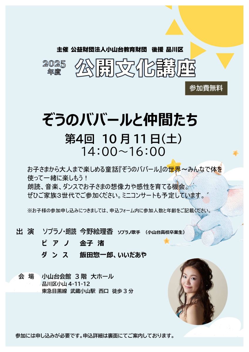 10月開催の公開文化講座は、童話『ぞうのババール』の世界を、朗読・音楽・ダンスで楽しく体験する講座となっております。