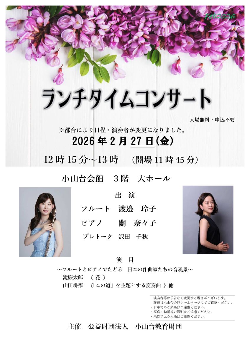 2月のランチタイムコンサートは、都合により日程及び出演者を変更して開催いたします。